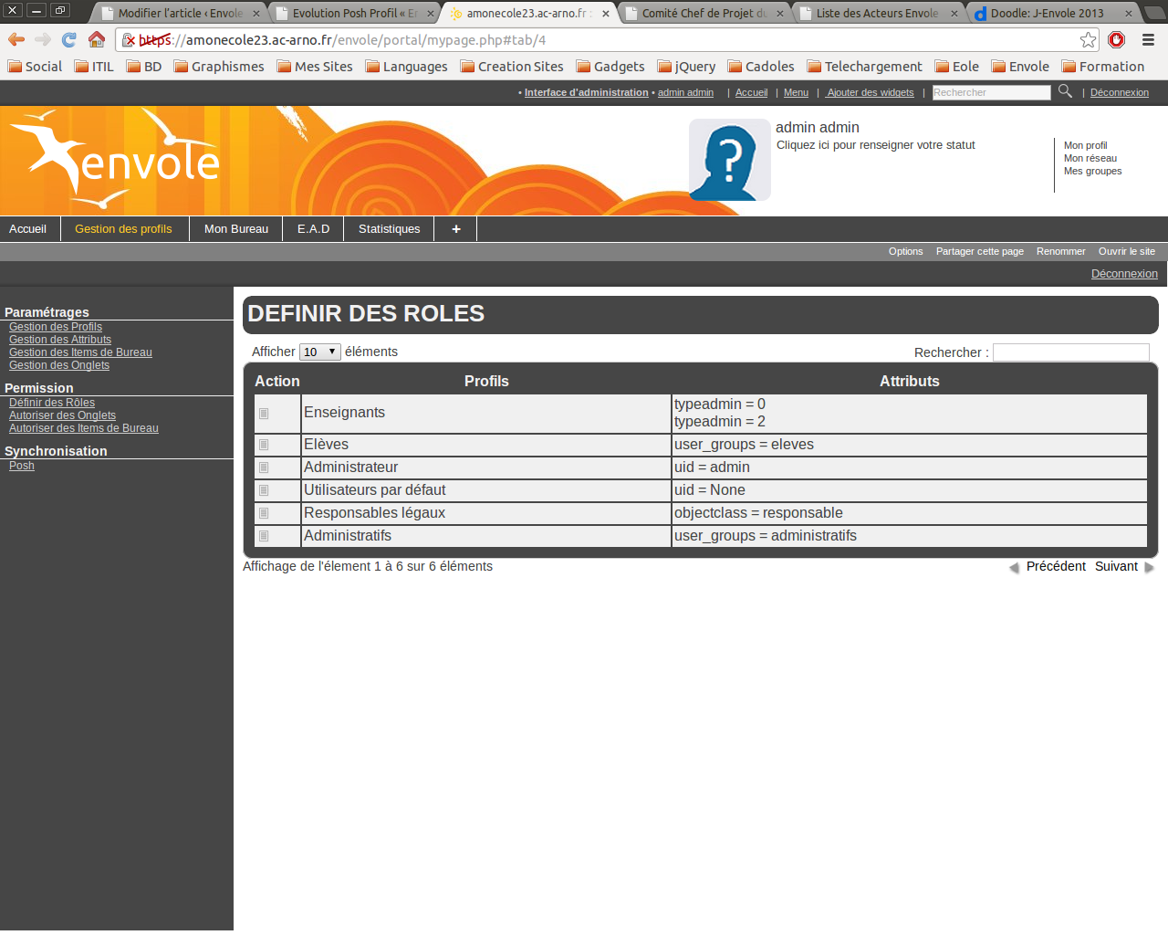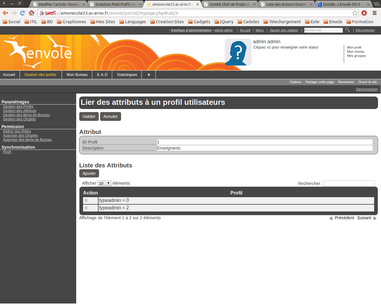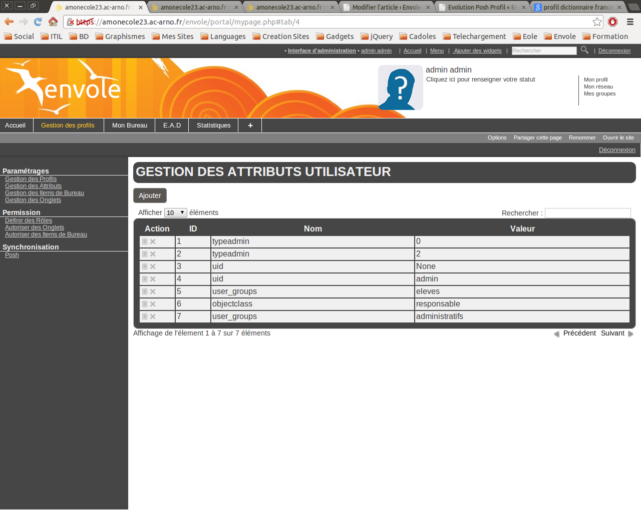 Par exemple un enseignant dans la copie d’écran ci-dessous aura un attribut “typeadmin = 0 OU typeadmin = 2”