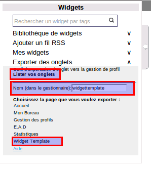 – Dans les bibliothèques de widget, clique sur “Exporter des onglets / Lister vos onglets”