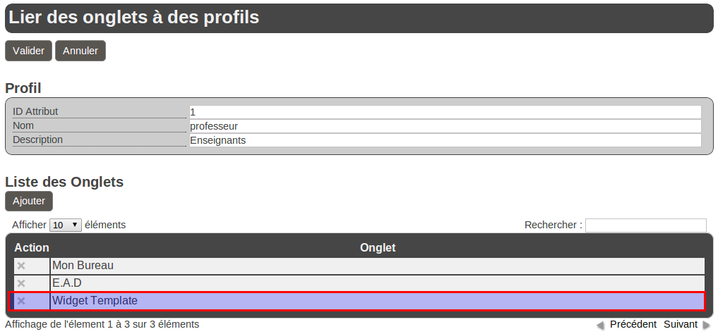 Liste des onglets pouvant être associés à un profil