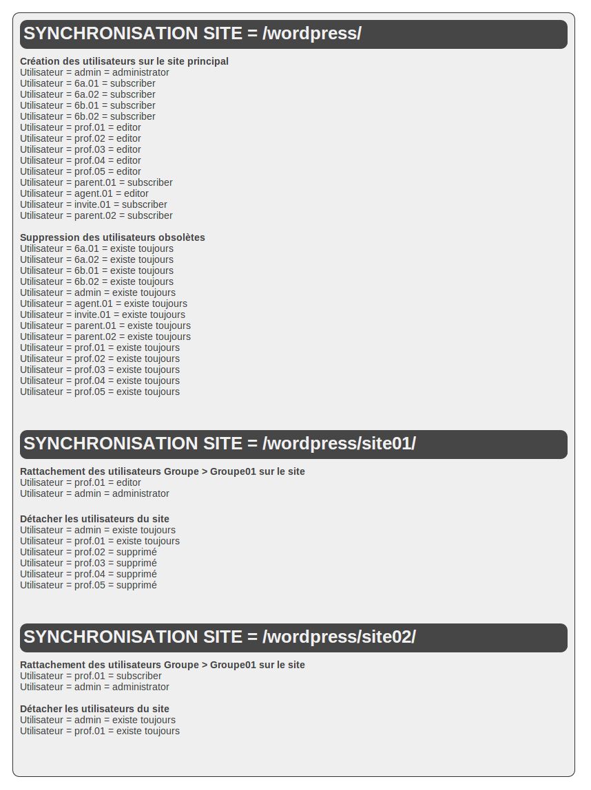 A l’initialisation seule le site principale sera synchronisé. Il sera nécessaire pour l’administrateur de venir activer ou non la synchronisation sur les site site du wordpress.